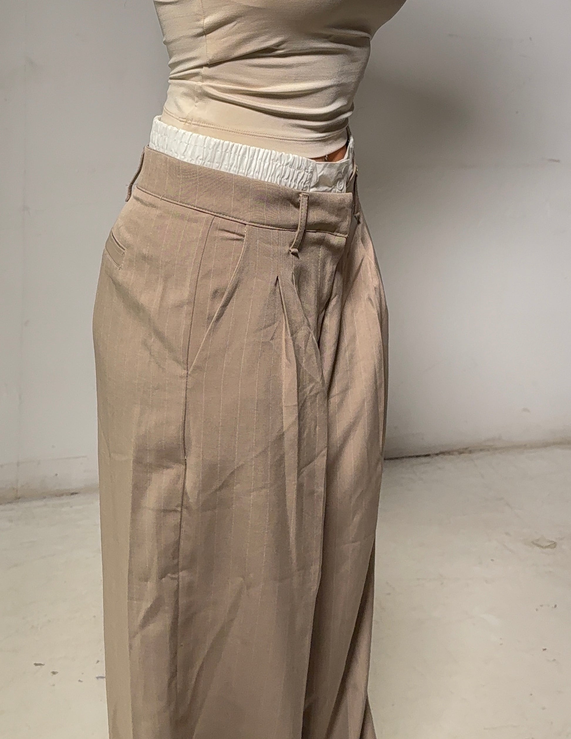 The Out Of Office Pants are designed to make you look put together without thinking twice. A wide-leg silhouette with soft pleats and subtle pinstripes creates quiet structure, while the contrasting waistband adds just enough attitude.