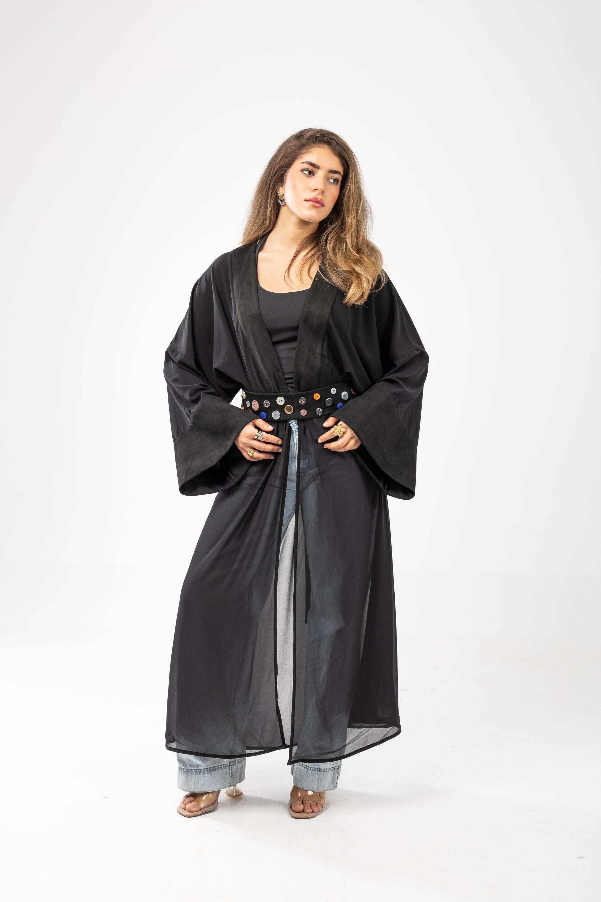 Designed with three beautifully balanced fabrics, it flows effortlessly over the body while adding depth and dimension. The wide, airy sleeves create graceful volume at the wrists, enhancing every movement with soft drama. Below, a sheer cascading layer reveals subtle shadows of the legs, offering a flattering, elongated silhouette with a hint of mystery.