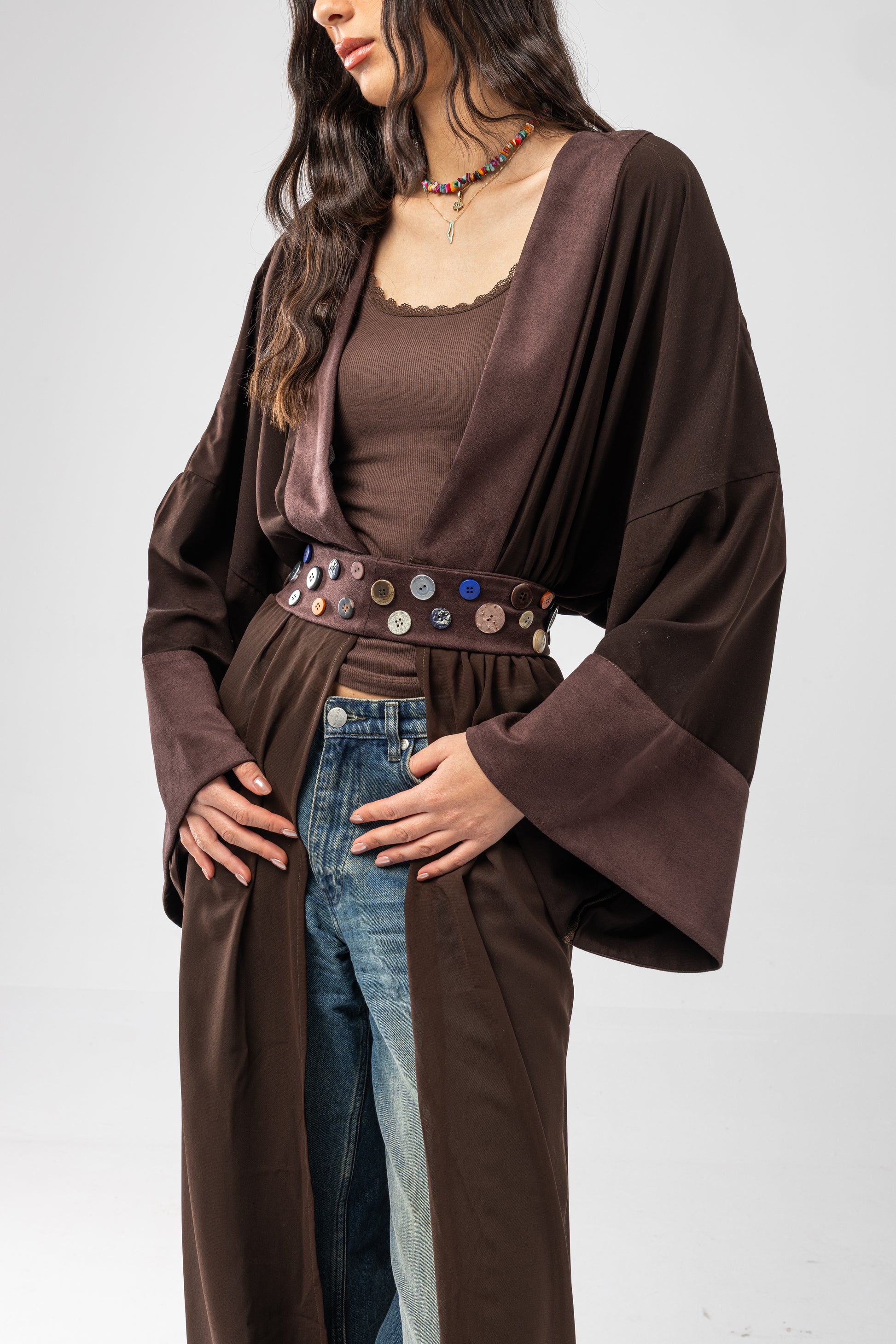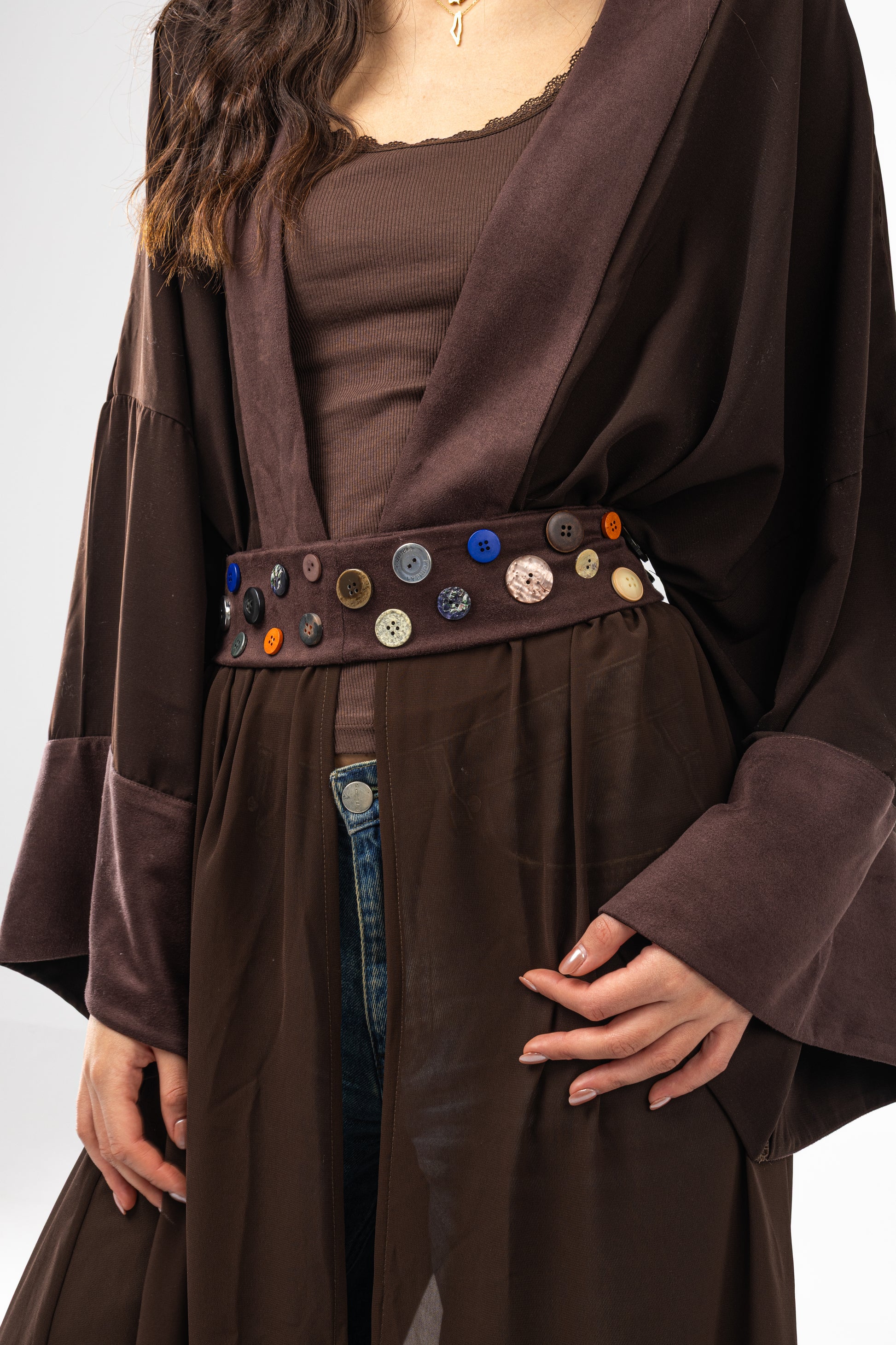 Crafted to define and flatter, this belt features intentionally mismatched buttons, each thoughtfully selected to create depth, texture, and character. The varied shapes, finishes, and subtle contrasts come together in perfect harmony, transforming functional fastening into an artful focal point.