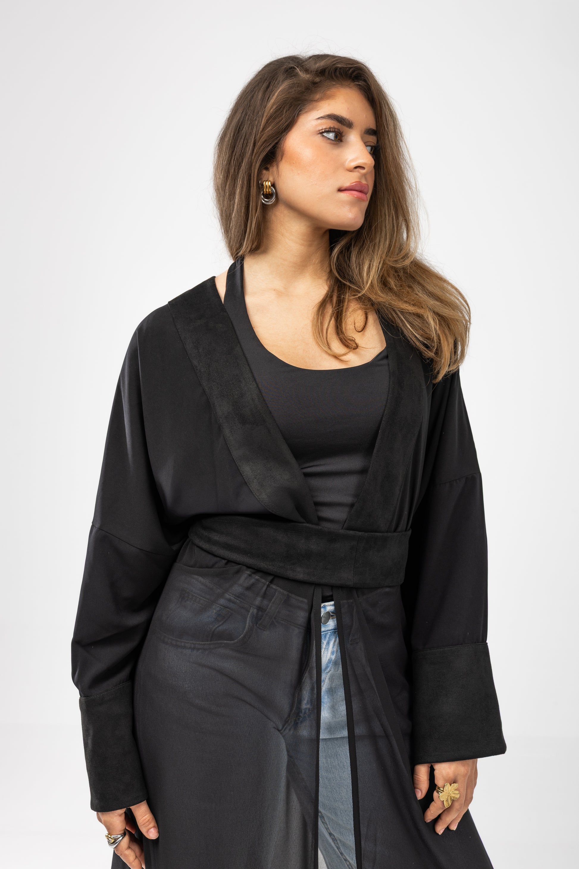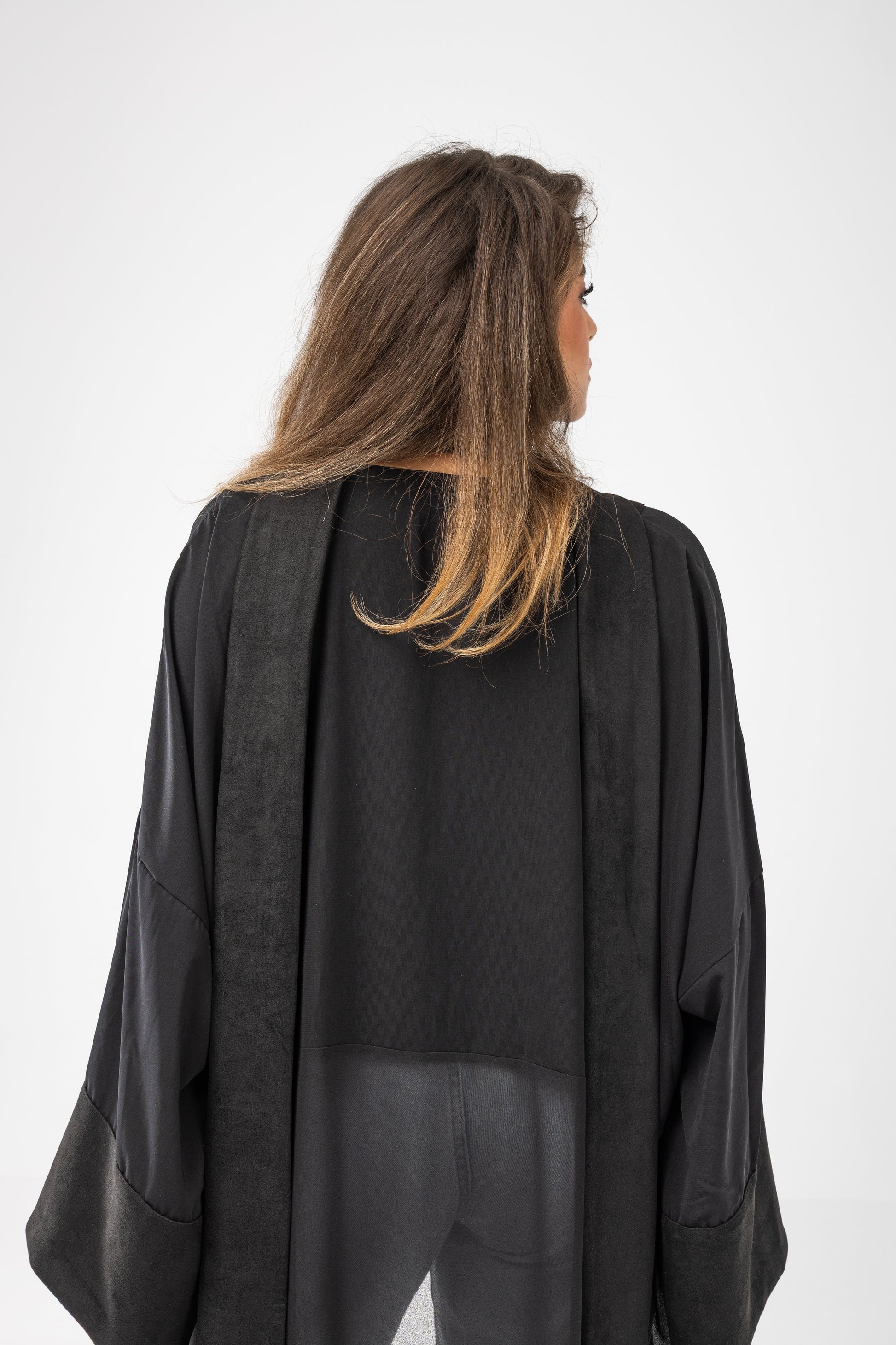 Designed with three beautifully balanced fabrics, it flows effortlessly over the body while adding depth and dimension. The wide, airy sleeves create graceful volume at the wrists, enhancing every movement with soft drama. Below, a sheer cascading layer reveals subtle shadows of the legs, offering a flattering, elongated silhouette with a hint of mystery.