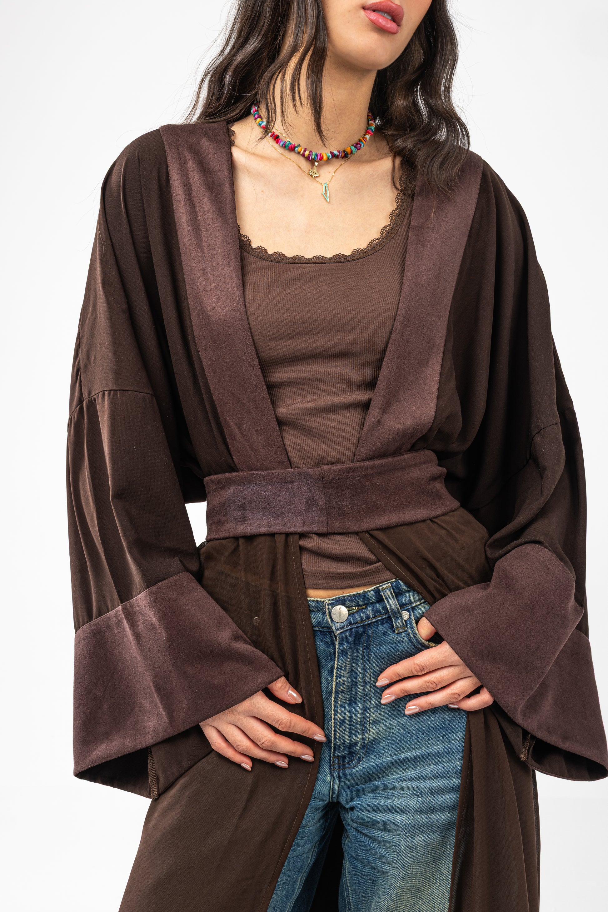Designed with three beautifully balanced fabrics, it flows effortlessly over the body while adding depth and dimension. The wide, airy sleeves create graceful volume at the wrists, enhancing every movement with soft drama. Below, a sheer cascading layer reveals subtle shadows of the legs, offering a flattering, elongated silhouette with a hint of mystery.